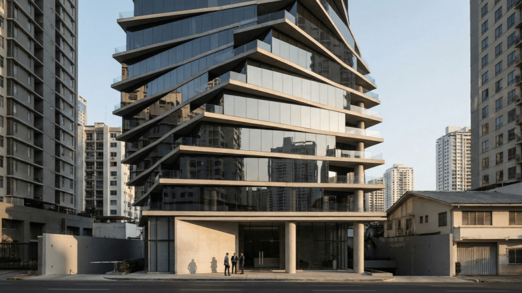 A estrutura da F&F Tower é pensada para proporcionar máxima estabilidade. Ela usa um sistema chamado shear-walled frame, que combina um núcleo de concreto armado com colunas externas. Essas colunas ajudam a resistir tanto ao vento quanto a possíveis tremores de terra. Fazer tudo isso em um lote pequeno e cercado por construções densas não é fácil, especialmente com um posto de combustíveis tão perto. Portanto, o desenho das estacas e da fundação foi cuidadosamente planejado para evitar problemas de recalque, além de economizar recursos.